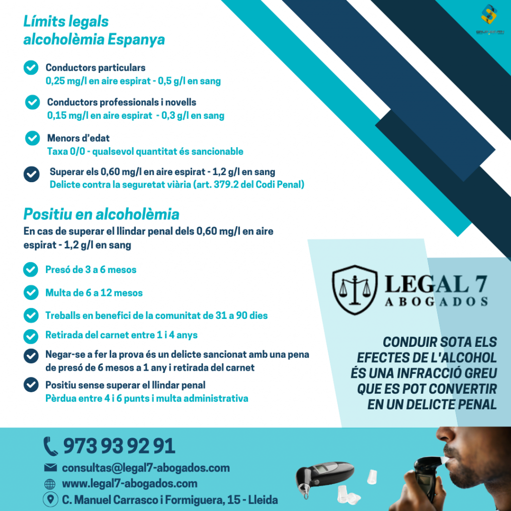 - Contacta com més aviat millor amb un advocat especialitzat en alcoholèmies. És clau per revisar el procediment, detectar irregularitats i preparar-ne la defensa. Recorda, a Legal 7 Advocats som especialistes en la tramitació de positius per alcoholèmia i drogues.
